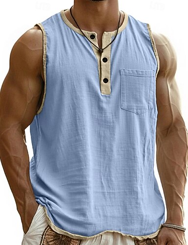 Hombre Camisa de lino Camiseta sin mangas Top Camisetas Interiores Sin Mangas Henley Verano Primavera Plano Moda Design Básico Bolsillo Botones Casual Vacaciones Calle Negro Rosa Azul Marino Camiseta