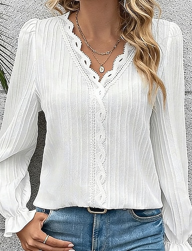 Mujer Camisa Camisa de encaje Camisa casual Encaje Retazos Color sólido Plano Elegante Vacaciones Moda Manga Larga Escote en Pico Tops regulares Diario Festivos Noche Azul Piscina Negro Blanco Rosa
