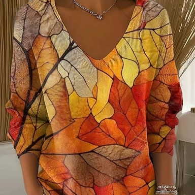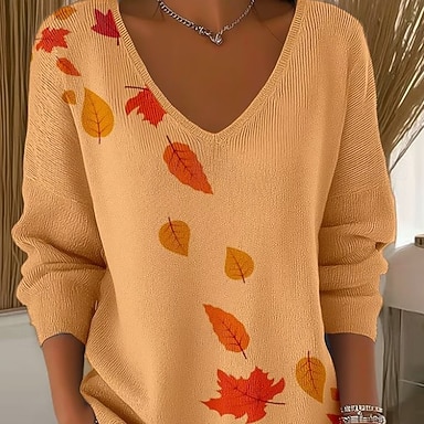 Mujer Pulóveres Elegante Moda Ropa de calle Floral Graphic Escote en Pico De Punto Manga Larga Tops regulares Tejer Fin de semana Amarillo Color Jengibre Otoño Invierno