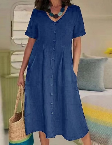 Mujer vestido largo vestido largo Lino de algodón sintético Vestido de cambio Vestido informal Moda Exterior Fiesta Festivos Ajuste regular Plano Manga Corta Escote en Pico Rosa Caqui Azul Oscuro