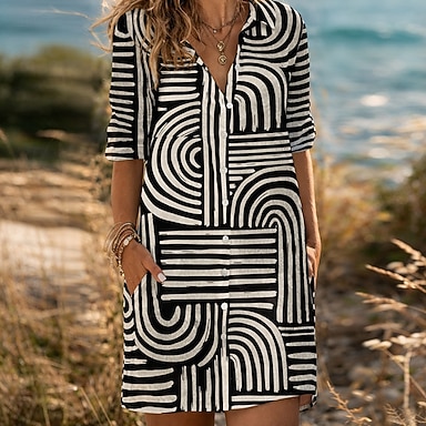 Mujer Mini vestido Lino de algodón sintético Vestido de Camisa Vestido Kaftan Vestido informal Moda Moderno Diario Playa Fin de semana Ajuste regular Geométrico Manga Corta Cuello Camisero Caqui