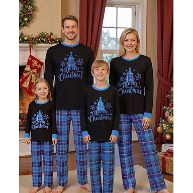Mirada familiar Navidad Pijamas navideños familiares Pijamas Conjuntos familiares Graphic Plaid Copo Hogar Estampado Azul Piscina Manga Larga Diario Trajes a juego