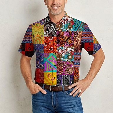 Retro Antiguo Hippie Años 70 Camisas Mangas cortas Hippie Retazos Bohemio Étnico Disfraz Hombre Festival de Música Fiesta Ropa Cotidiana Adulto Camisas Primavera verano