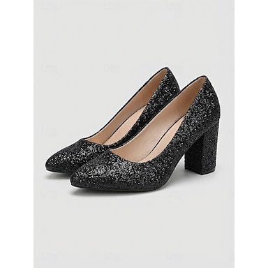 Elegantes zapatos de tacón negro con purpurina para mujer: zapatos de trabajo profesionales con tacón de bloque y un brillo sutil para cenas de negocios y fiestas de oficina. &ropa de trabajo