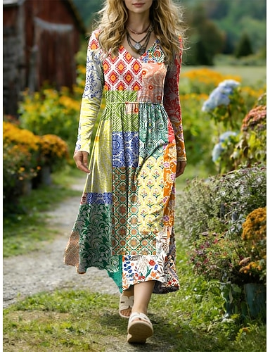 Mujer Vestido Midi Vestido de una línea Casual Boho Cita Ajuste regular Graphic Geométrico Abstracto Manga Larga Escote en Pico Azul Piscina Rojo Azul Real Morado Verano Primavera