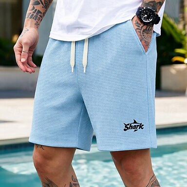 Hombre Tiburón impresión de letras Pantalones cortos de gofres Pantalones cortos casuales Pantalones cortos texturizados Media cintura Moda informal Diario Vacaciones Cintura elástica con cordón