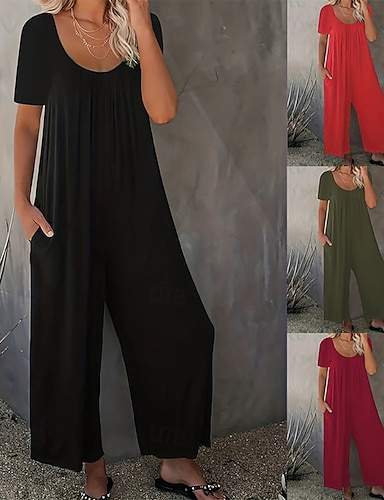 Mujer Mono Activo Color sólido Manga Corta Perneras anchas Cuello Barco Bolsillo Diario Vacaciones Holgado Negro Vino Rojo Verano