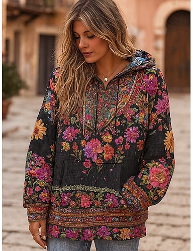 Sudadera con capucha estilo bohemio vikingo para mujer, con estampado floral, informal, de manga larga, con capucha, estilo regular, con estampado de patchwork urbano, bolsillo delantero, color negro,