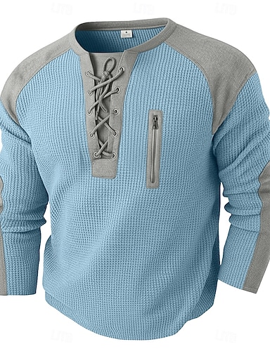 Hombre Camiseta con diseño de gofre Camiseta Manga Larga Escote Redondo cuello con cordones Otoño Otoño invierno Color sólido Bloque de color Tradicional / Retro Casual Correa Hogar Exterior Deporte