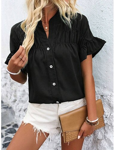 Mujer Blusa Volante Color sólido Elegante Casual Manga Corta Escote en Pico Tops regulares Diario Azul Piscina Negro Blanco Rosa Fucsia Verano Primavera