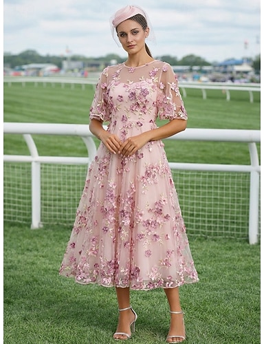 Funda Columna Vestido Midi Vestido de encaje Vestido formal Vestido de flores Vestidos de coctel Elegante Vintage Lentejuelas Manga Corta Escote de ilusión Fiesta de jardin Boda Gasa Tul Espalda