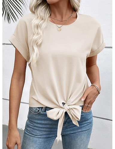 Mujer Blusa Color sólido Elegante Básico Casual Manga Corta Cuello Barco Tops regulares Diario Trabajo Negro Rojo Caqui Beige Verano Primavera Otoño Invierno