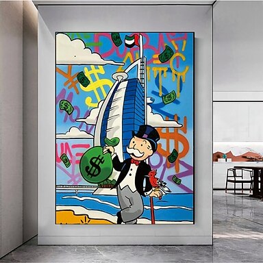 Hecho a mano pintado a mano pintura al óleo wall street art moderno abstracto alec monopoly dinero pintura decoración del hogar lienzo enrollado sin marco sin estirar