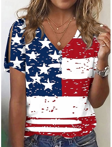 día de la independencia americana Mujer Camiseta Bloque de Color Estampado Graphic Bandera Vintage Elegante Clásico Manga Corta Escote en Pico Tops regulares Diario Noche Fin de semana Azul Piscina