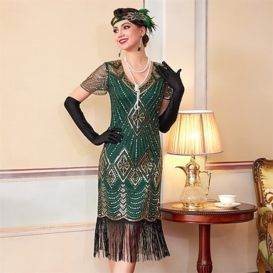 Rugido 20s 1920s Hasta la Rodilla Vestidos Vestido Flapper Accesorios Mangas cortas El gran Gatsby Lentejuelas Borlas Lentejuela Borla Escote en Pico Disfraz Mujer Mascarada Fiesta de baile Fiesta de