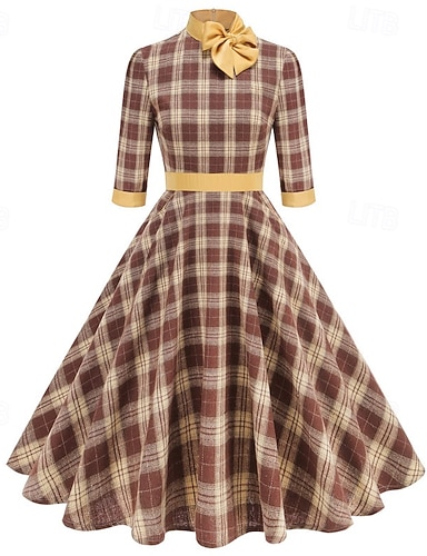 Mujer Vestido Midi Vestido de Columpio Vestido Tartán Vestido elegante Elegante Vintage Moda Diario Exterior Oficina Ajuste regular Plaid Plano Manga Larga Cuello Alto Amarillo Claro Amarillo Otoño