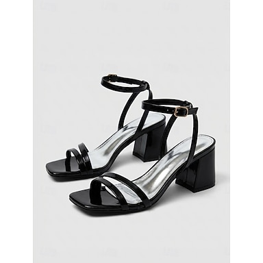 Sandalias minimalistas negras de tiras para mujer: cómodas sandalias de tacón cuadrado con punta cuadrada, ideales para el día a día y conjuntos de verano. &Paseo informal por la ciudad