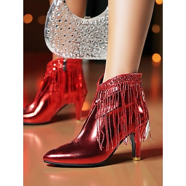 Botines rojos metálicos con flecos para mujer - botines de tacón con punta brillante para fiestas, bailes, eventos nocturnos y cócteles