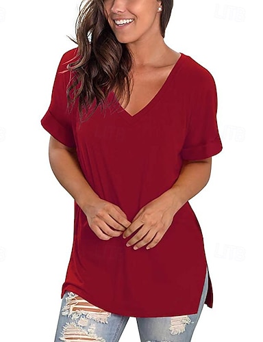 Mujer Camiseta Camiseta superior Color sólido Elegante Moda Clásico Manga Corta Escote en Pico Tops regulares Diario Noche Fin de semana Vino Verde Ejército Azul Real Morado Verano Primavera