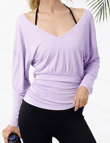 Mujer Tee Camiseta deportiva Cintura elástica Color sólido Elegante caliente Casual Manga Larga Escote en Pico Tops regulares Gimnasia Deportes Fin de semana Marfil Rojo Púrpula Claro Café Primavera