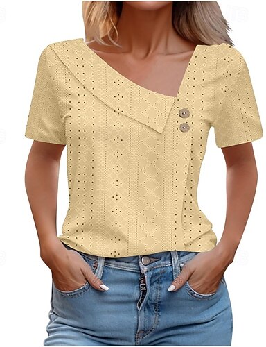 Mujer Camisa Camisa de punto Parte superior con ojales Blusa Encaje Plano Elegante Básico Clásico Manga Corta Escote en Pico Tops regulares Casual Diario Playa Blanco Verano Primavera