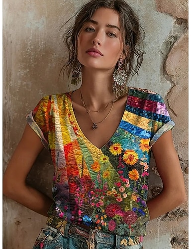 Mujer camisa boho Camiseta Estampado Floral Graphic Bohemia Vintage Clásico Manga Corta Escote en Pico Tops regulares Diario Rosa Verano Primavera