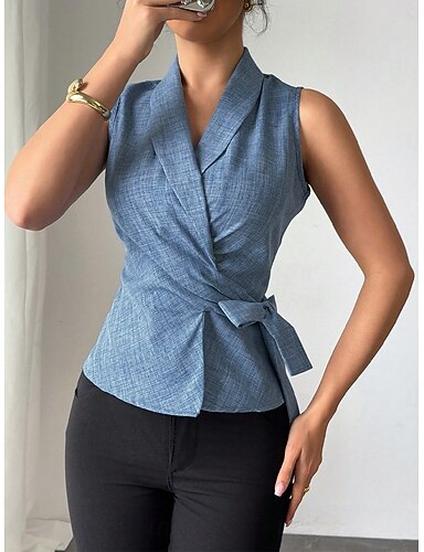 Mujer Camisa Camiseta sin mangas Blusa Camisa sin mangas corbata frontal Plano Elegante Clásico Moderno Sin Mangas Cuello Camisero Tops regulares Diario Festivos Noche Azul cielo Verano Primavera