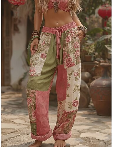 Mujer Perneras anchas Pantalones Vacaciones Vintage Moda Longitud total Media cintura Floral Correa Retazos Bolsillo Confortable Transpirabilidad Rígido Microelástico Diario Exterior Vacaciones Rosa