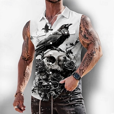 Hombre Cráneos Cuervo Raven Camisa Abotonar la camisa Camisa sin mangas Sin Mangas Estilo gótico oscuro Exterior Casual Verano Primavera Cuello Vuelto Impresión 3D Dos bolsillos delanteros Azul