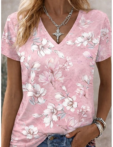 Mujer Camiseta Estampado Floral Graphic Plantas Vintage Elegante Clásico Manga Corta Escote en Pico Tops regulares Diario Azul Piscina Blanco / azul Rosa Verano Primavera