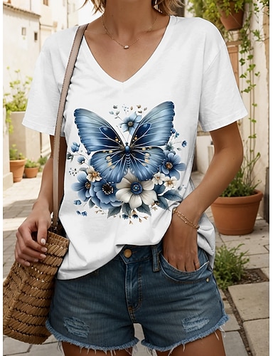 Mujer Camiseta Estampado Floral Graphic Mariposa Vintage Elegante Clásico Manga Corta Escote en Pico Tops regulares Diario Noche Fin de semana Azul Piscina Negro Blanco Amarillo Rosa Verano Primavera