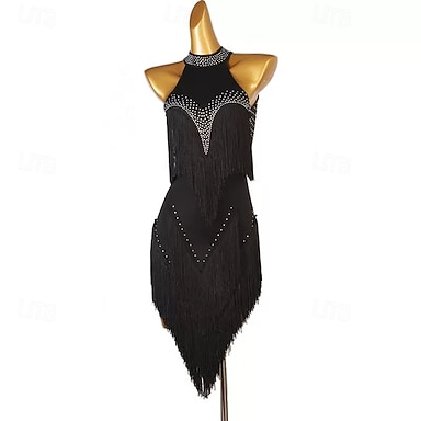 negro de mujer &Vestido de baile latino con flecos dorados, cuello halter, dos tonos, para rumba, salsa, cha-cha, baile de salón.