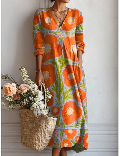 Vestido Maxi de Mujer de Lino Como Transpirable Ligero Vestido de Verano Casual de Fiesta de Vacaciones Ajuste Regular Floral Gráfico de Manga Larga Cuello en V Azul Amarillo Rojo Naranja Verano