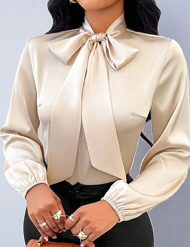 Mujer Camisa Blusa de satén Camisa para Vestido Color sólido Plano Elegante Moda Casual Manga Larga Corbata en el cuello Tops regulares Ropa de calle Oficina Trabajo Rojo Verde Trébol Albaricoque