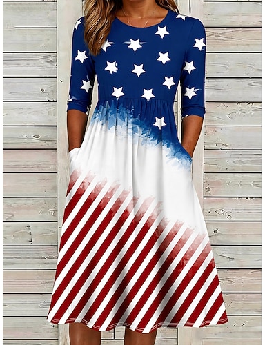día de la independencia americana Mujer Vestido Midi Vestido de cambio Casual Diario Vestido de verano vestido de primavera Ajuste regular Floral Estrellas y rayas Manga 3/4 Cuello Barco Azul Piscina