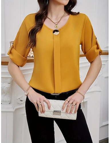 Mujer Camisa Camisa de raso Camisa casual Lazo Plano Elegante Básico Clásico Manga Corta Corbata en el cuello Tops regulares Diario Festivos Noche Amarillo Verde Claro Azul Real Púrpula Claro Naranja