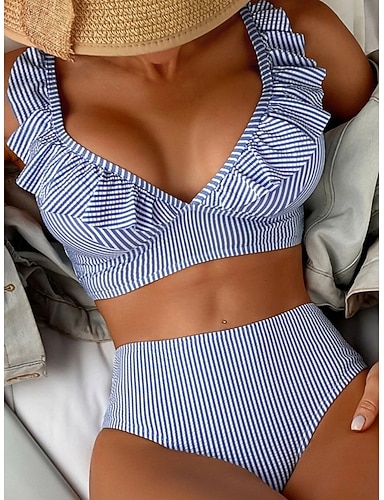 Mujer Bañadores Bikini 2 piezas Slips Traje de baño Volante Delgado Espalda al Aire Vacaciones Ropa de playa A Rayas Escote en Pico Sin Mangas Trajes de baño