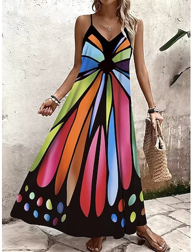 Mujer Vestido maxi Vestido de verano Vestido de una línea Vestido lencero Vacaciones Casual Playa Noche Ajuste regular Graphic Bloque de color Sin Mangas Escote en Pico Negro Verano Primavera