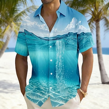 Hombre Oceano Agua de mar camisa hawaiana Abotonar la camisa Manga Corta Hawaiano vacaciones en la playa Verano Primavera Cuello Vuelto Impresión 3D camisas con cuello Un bolsillo delantero Azul