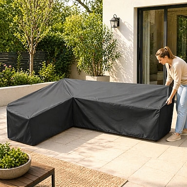 Fundas para muebles de jardín en forma de L, impermeables, a prueba de polvo, para conjuntos de comedor y sofás de exterior, protectoras para césped en invierno (215x215x87cm, negro)