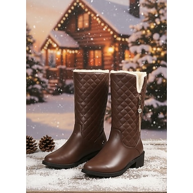 Botas de invierno acolchadas marrones para mujer con forro de piel sintética y detalle de cremallera, elegantes y cálidas, perfectas para fiestas navideñas, actividades al aire libre en invierno y uso