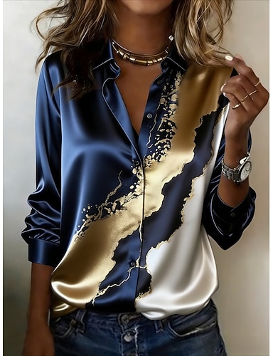 Mujer Camisa Camisa de raso Estampado Impresión de mármol Vacaciones Moda Diario Manga Larga Cuello Camisero Tops regulares Diario Festivos Noche Azul Piscina Verano Primavera Otoño