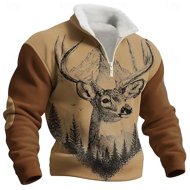 Hombre Venados Vellón Sudadera Moda Casual 3D Caza Escote Chino Cremallera de un cuarto Exterior Ropa de calle Vacaciones Regalo Marrón Caqui Gris Oscuro Gris Media Cremallera Otoño Invierno Diseñador