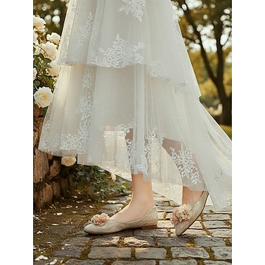 Zapatos planos florales color champán para mujer con acabado texturizado, elegantes zapatos de novia para una boda al aire libre en un jardín.