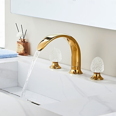 Grifo de baño dorado de 360° con tres orificios y manija de cristal, estilo retro vintage.