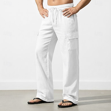 Hombre Pantalones de lino Pantalones Pantalones de verano Pantalones de playa Correa Bolsillo Cintura elástica Plano Diario Ropa de calle Moda Casual Negro Blanco