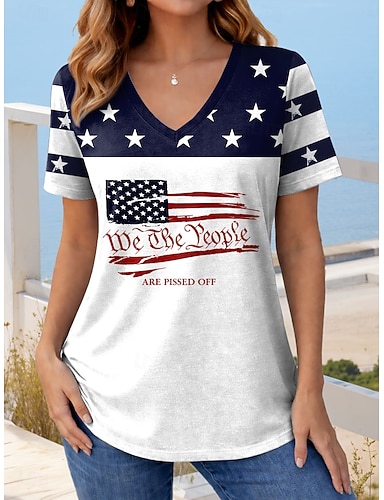 día de la independencia americana Mujer Camiseta Estampado Graphic Bandera Vintage Elegante Clásico Manga Corta Escote en Pico Tops regulares Diario Azul Piscina Negro Blanco Rojo Verano Primavera