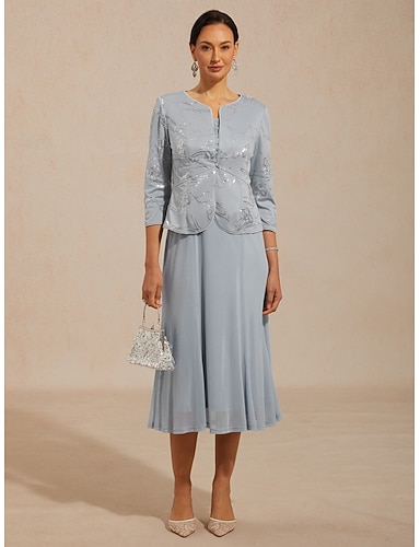 Conjunto de vestido para mujer, chaqueta con lentejuelas y estampado floral, elegante, manga 3/4, cuello redondo, tops regulares, para fiesta de noche, cóctel, atuendo azul polvoriento, verano,