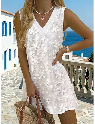 Mujer Mini vestido Vestido de encaje blanco Elegante Moda Playa Vacaciones Festivos Ajuste regular Floral Sin Mangas Escote en Pico Blanco Verano Primavera