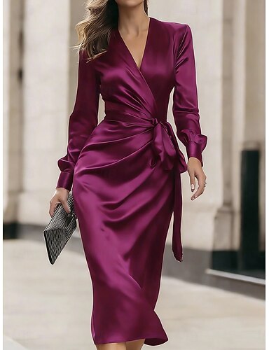 Mujer Vestido Midi Vestido de raso Vestido de Fiesta Elegante Moda Moderno Exterior Vacaciones Fiesta Ajuste regular Plano Manga Larga Escote en Pico Morado Verano Primavera Otoño
